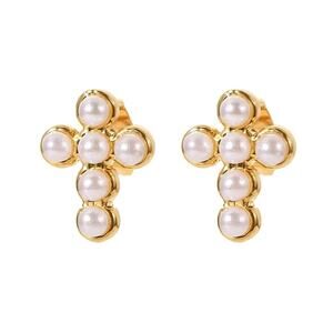 Pearl Cross Stud Earrings 18K Gold Plated Minimalist