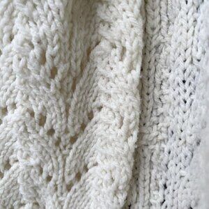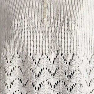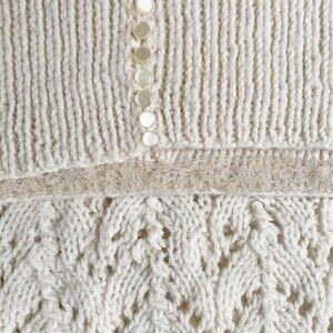 Hand knit lovely ivory long sleeve pullover sweater with cute pearlesque buttons and a stunning square neck.Top front sweater is cable knit, torso is chunky knit, bottom hem is ribbed. Sweater has slight stretch but not at the bottom hem. Delicate lace hand sewn on the trimming inside the bottom hem and back of neck. Buttons are an accent and not functional.