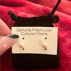 Pearl stud earrings with black velvet, drawstring storage pouch.