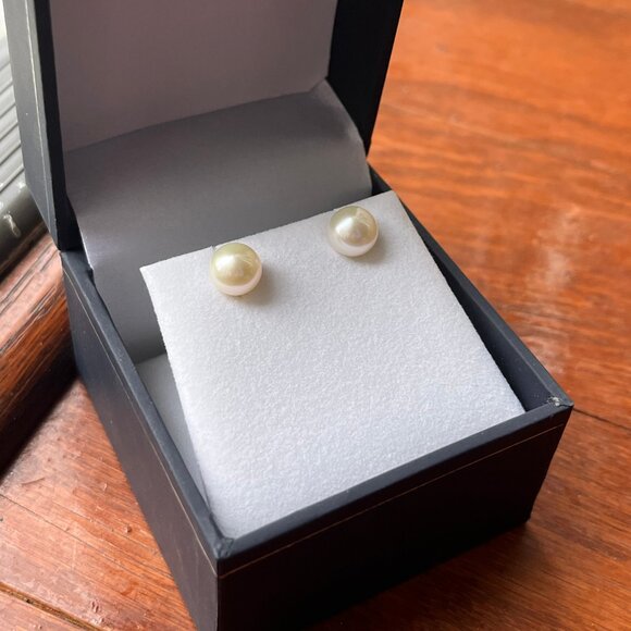 Genuine pearl stud earrings. Like new. In original box. Silver settings. Likely purchased from The Pearl Source.