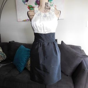 Cocktail dress featuring a silk top with pearl, rhinestone and sequin embellished bodice, faux commerbund waist and pocketed skirt. Excellent condition.