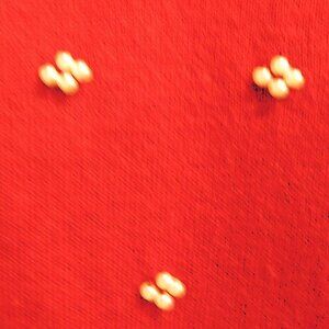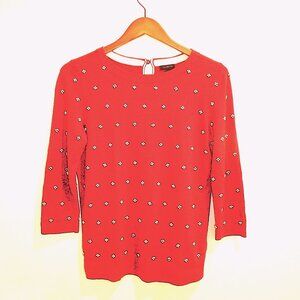 Red sweater with faux pearl embellishments on front and 3/4 sleeves. Keyhole closure in back. Rayon, nylon, cotton blend.