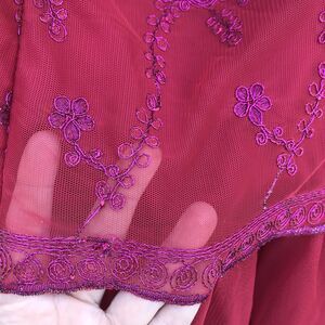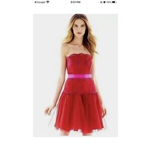 This is a pre-owned Pearl Georgina Chapman of Marchesa party dress in size 0. The dress is strapless with a zip closure and a mesh fabric type. The color is a combination of red and hot pink. The dress has a lace bustier and a drop waist feature. It is suitable for occasions such as weddings and parties. The dress falls above the knee and has a sleeveless style.