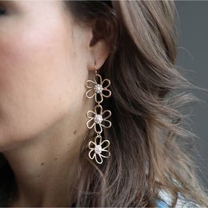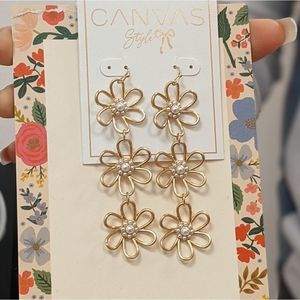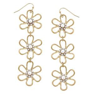 Add a touch of romance to your look with these pearl and gold flower drop earrings. Designed with three cascading floral links, each accented with luminous white pearls and worn gold plating, these 3" earrings are perfect for bridal vibes, boho chic, or everyday glam. Lightweight yet bold, they’re a dreamy addition to any jewelry lineup.