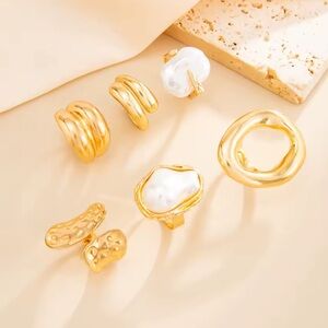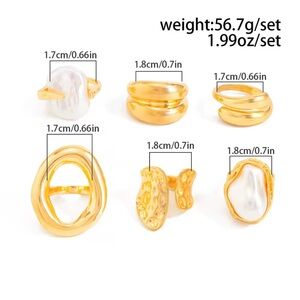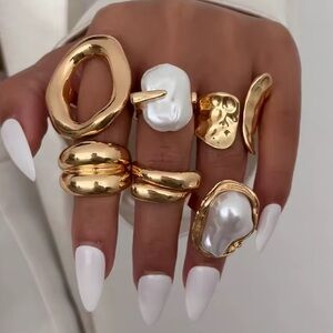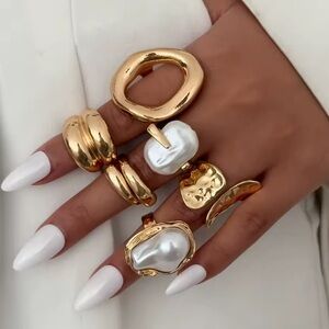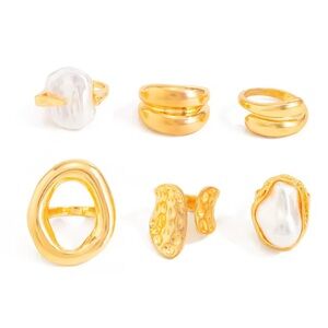 Chic Anthropologie ring set in polished gold with white pearl accents. Mix-and-match stackable styles. Sculptural and contemporary silhouettes. Lightweight feel for everyday wear. Eye-catching centerpiece rings for dressing up any look.