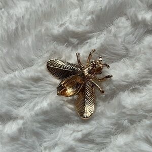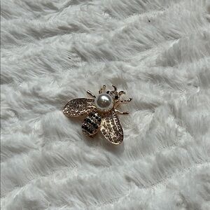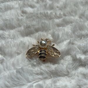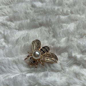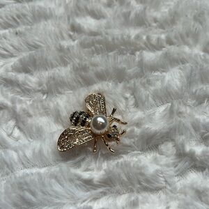 Elegant bee brooch with gold wings and black accents. Features a pearl detail.