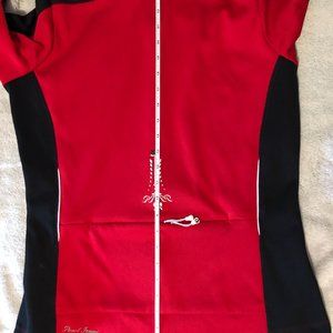 - Red with black on sleeves, white piping, and reflective elements.