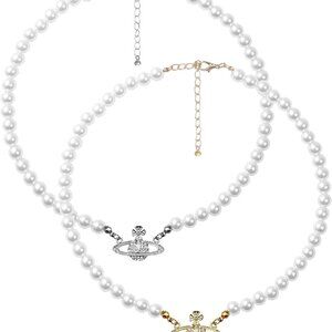 Features: Beautiful artificial pearl and Rhine necklace set with a delicate crystal chain and a rose gold lobster clasp. The unique Saturn-inspired design adds a touch of modern elegance and charm, perfect for special occasions or everyday glamour.