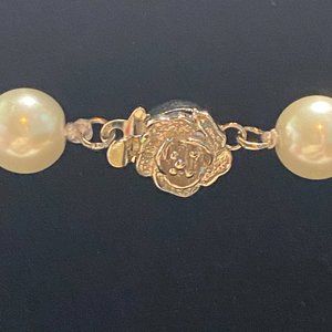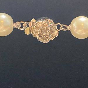 Pearly white Pearl Necklace with silver flower style clasp. Hand Knotted 18" Strand.