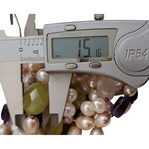 This lovely necklace features a long strand of bright and beautiful pearls, quartz, and amethyst that are knotted in between and are very smooth to the touch. The pearl bead measures approximately 9 mm, the amethyst 7mm, and the quartz 15 mm in size. The gemstones of this necklace are individually knotted and lavishly hang at 60 inches in total length. This long necklace will make a favorite accessory that you will reach for often because of its versatility and easy styling.