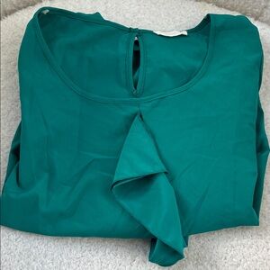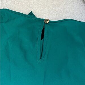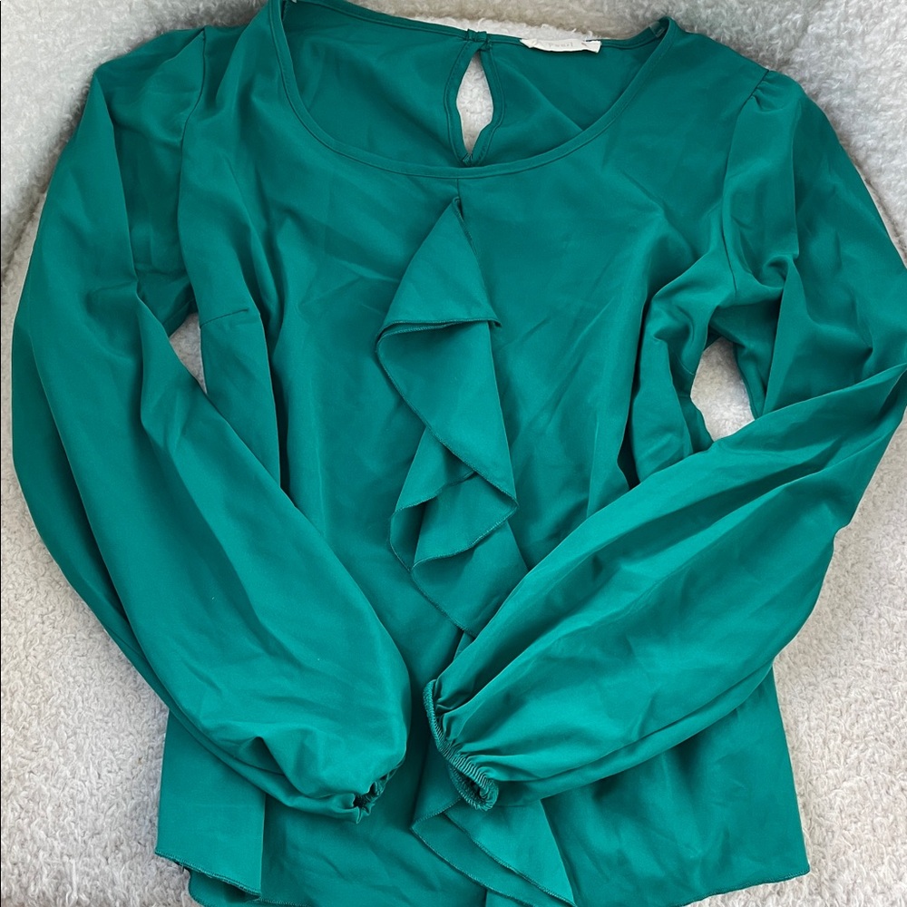 Chic teal blouse with ruffle detail. Long sleeves and elegant design. Perfect for versatile styling. Beautiful green, keyhole back