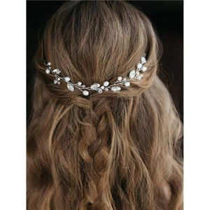 In a world where love shimmers like radiant pearls, a bride embarks on her journey to forever. Our exquisite pearl wedding hair vine, adorned with sparkling rhinestones and crystals, becomes a cherished symbol of elegance and grace. The delicate intertwining vines and glistening pearls reflect the magic of a wedding day. Let this stunning silver hairpiece adorn your tresses, adding a touch of enchantment to your bridal look.