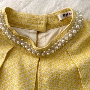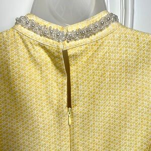 Sweet and Feminine pretty little thing gingham textured print yellow and pearl Dress. Asymmetrical dress that cinches at the waist. The length hits just above the knee. Gorgeous three rows of attached pearls that hooks around the neckline. Sleeveless. Fully lined.
