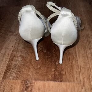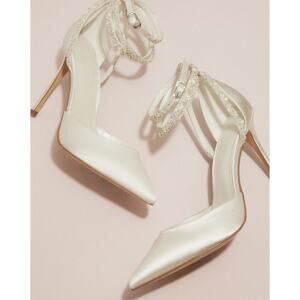 These pumps feature a sleek satin finish, delicate pearl and crystal embellishments, and a stylish ankle-wrap design that will make you feel like royalty. Don't miss the opportunity to own a pair of these beautiful pumps and elevate your shoe collection to the next level! They are available in size 8.5M and 9M.
