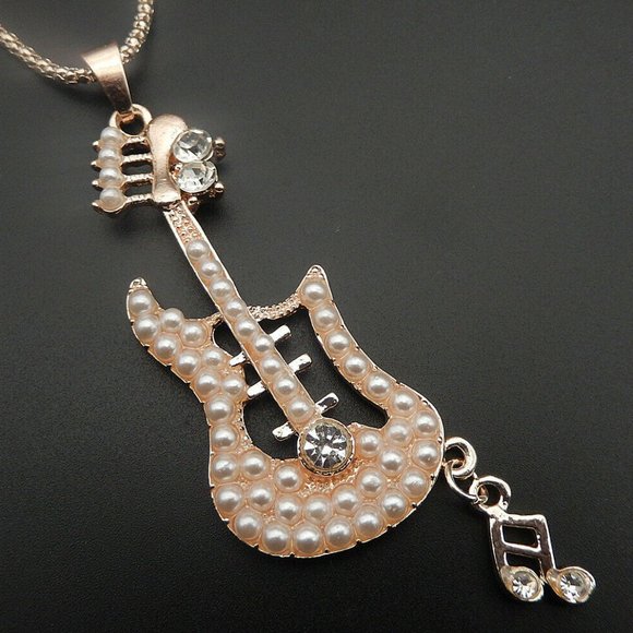 Pearl and Crystal GUITAR & Music Note NECKLACE 27" Chain