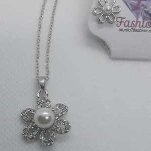 A stunning pearl and rhinestone set! This one is a great choice for a young lady. The necklace measures 18 inches with a lobster clasp. The pendant measures .75 inches and the earrings measure .25 inches.
