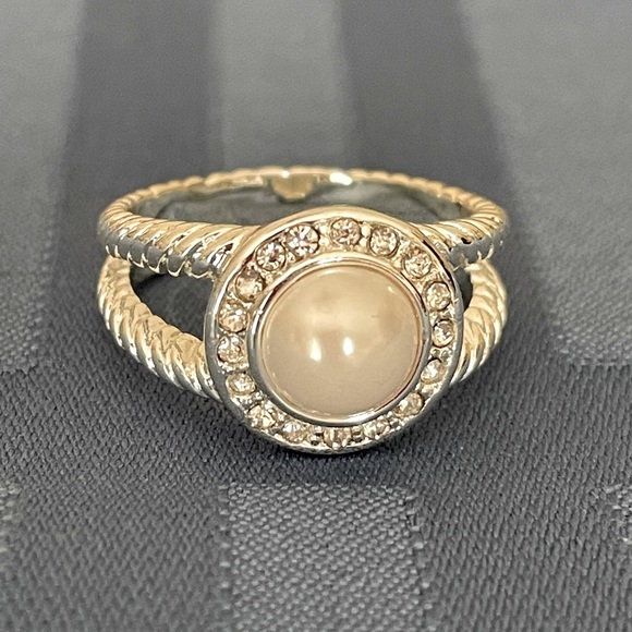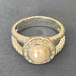 Feminine, braided double band, silver-colored ring with a singular round pearl centerpiece surrounded by rhinestones. Never worn and in like-new condition. No flaws. Size 8.5