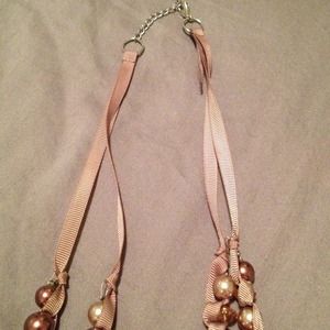 Necklace with various colored pearls and plastic jewels tied together with lace. Very pretty on. Durable.