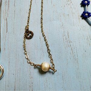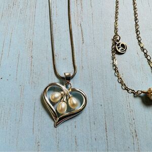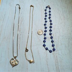 Silvertone Heart Genuine Pearl 16 in, Goldtone genuine pearl 16 in, Blue Flower beaded choker 13 in.