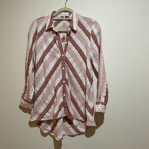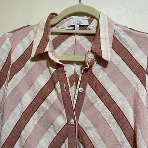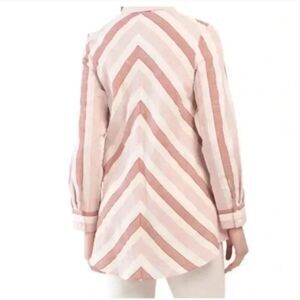 Pearl by Lela Rose Linen Striped Button Down High Low Hem Shirt Top Blush Multi. Collared button up blouse. Long sleeve. High low hemline. Linen blend. Warm tone pink chevron stripes.