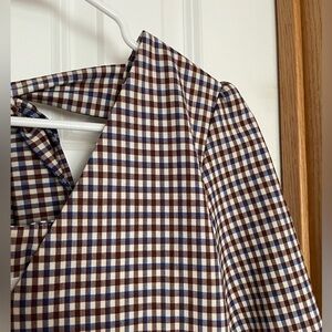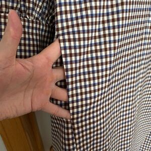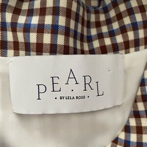 Like new wool blend checkered pattern shift dress from Pearl by Lela Rose. This is a sample piece so unsure of exact size but I would guess that would fit a size 6. Measurements included below. Beautiful brown, blue and cream pattern. Large bow tie detail on the back. 3/4 length sleeves with an open cuff. Also has pockets! No definitive fabric contents from the sample tags but I’m 99% sure it has wool in it. No itchy. No stains or flaws!