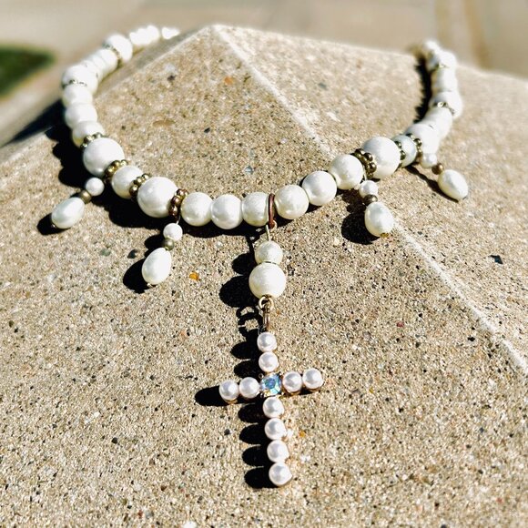 Pretty pearl cross strung on pearl beads with hanging pearls. Soft, feminine, can be worn by woman or younger girl. classy and elegant
