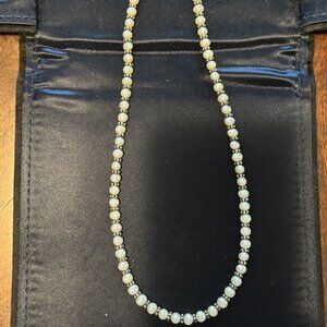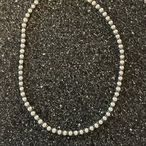 Beautiful genuine pearl and sterling silver set. Necklace is 15 inches long and bracelet is 6 inches. I found the sterling silver stamp on the necklace but couldnt see it on the bracelet. This delicate pair has silver flowers between every pearl, making this a unique and attractive pair.