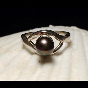 Sterling silver, eye design, size 7 ring set with amazing dark chocolate/black Pearl.