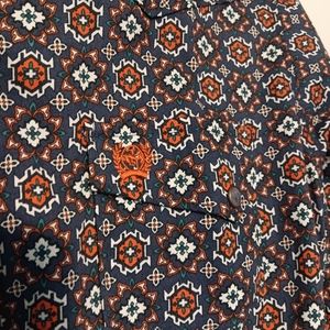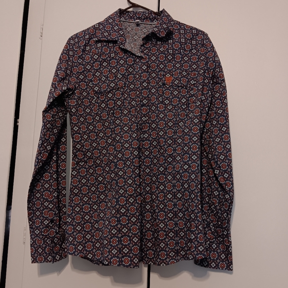 pearl snap buttondown shirt, purple and orange print, size L, Cinch