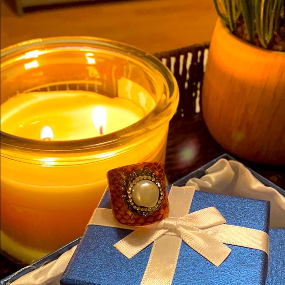 Freshwater pearl, Austrian Crystal and brown embossed faux leather ring. This is a very unique ring and a definite conversation starter. Adjustable size 6-8
