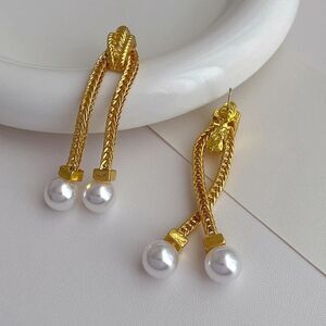 These stunning gold drop earrings feature elegant pearl accents, perfect for adding a touch of sophistication to any outfit. Ideal for both casual and formal occasions.
