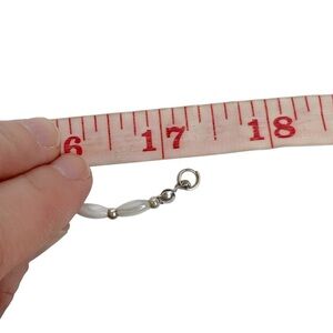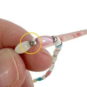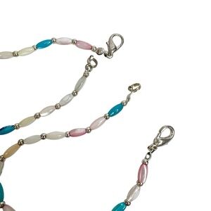 Pearlescent Tubular Acrylic Pastel Beaded Necklace and Bracelet Set. In preowned condition: light wear to the beads, wear in between the spacers/beads and one bead has chipped off (see circled pic). Unbranded. No precious metals or stones. Light colors of pink, blue and cream with in a pearlescent finish. Silver tone round spacers. Lobster claw closures. Vintage style. Strung on a plastic cord, which causes the necklace & bracelet to be wavy when not worn. Lightweight.