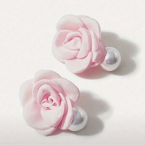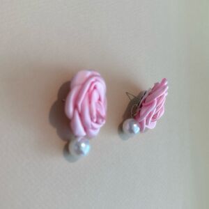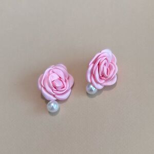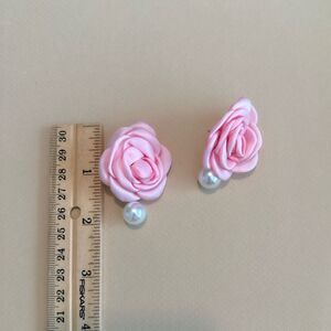Pink fabric flower pearl drop dangle stud earrings in gold tone hardware