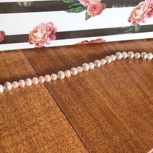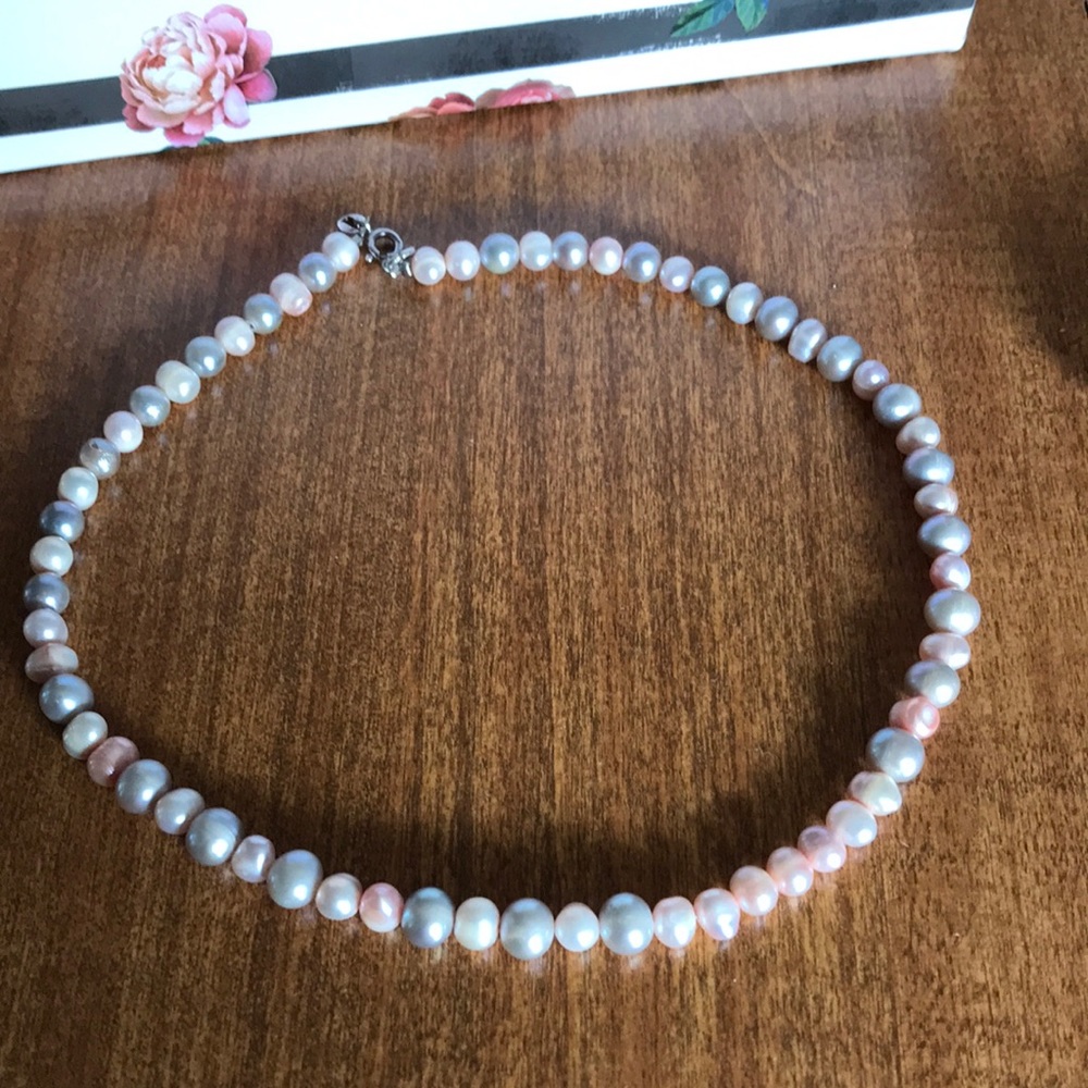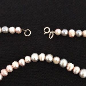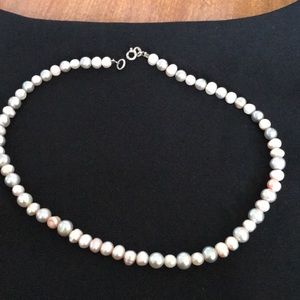 Freshwater pearl necklace. Different shades of pink and grey. App 15 inches long.