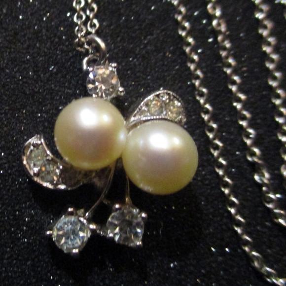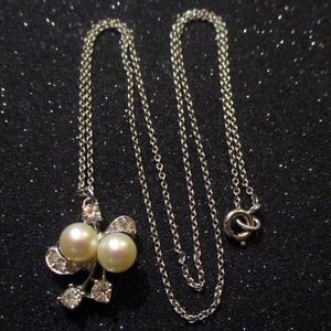 Two pearls* set into Sterling base, with 8 crystal stones in stylized bow and tassel pattern.