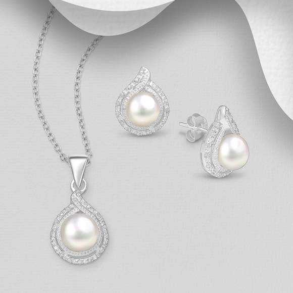 925 Sterling Silver Push-Back Earrings and Pendant Jewelry Set, Decorated with Freshwater Pearls and CZ