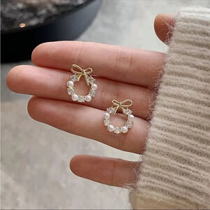 🌸NEW dainty pearl & diamond wreath earrings, wrapped with a bow! These beautiful minimalist inspired stud earrings are perfect paired up or down, with a dress for a date or weekend out!