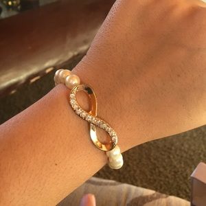 Pearls wrap the wrist with a gold infinity sign studded with diamonds