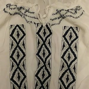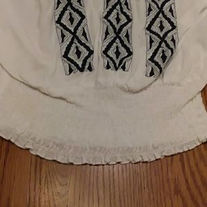🐞White peasants type blouse with cute blue Aztec type design on front, puffy sleeves & elastic waist! Adorable with your favorite jeans & anything else too!! NWOT🐞