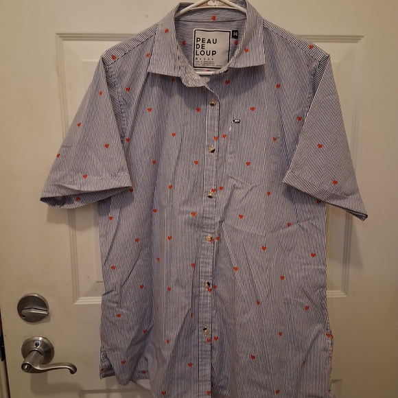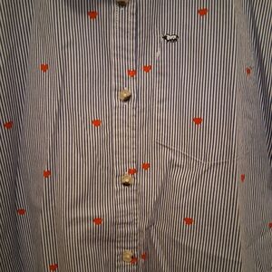 Stylish button-down shirt with blue stripes and red accents. Perfect for casual wear.