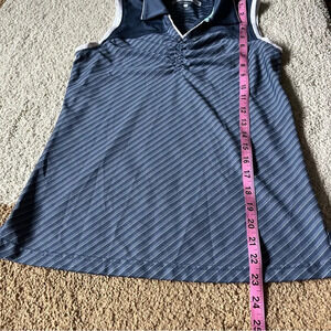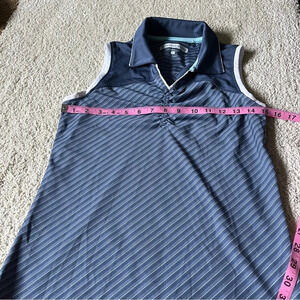 Size small gold polo tank top from Pebble Beach. Cinched front with collar. Blue and white design. EUC no flaws.