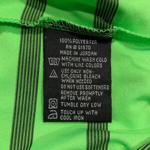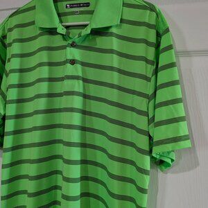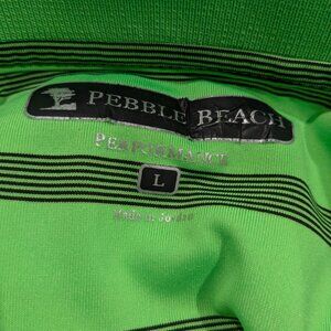 Pebble Beach men's performance golf polo shirt in bright green with black stripes. This pre-owned collared short sleeve polo features a three-button placket and is made of 100% polyester for comfort and breathability. Machine washable, it measures approximately 23" armpit to armpit, 29" from center back of neck to hem, and 10" sleeve from shoulder seam.