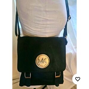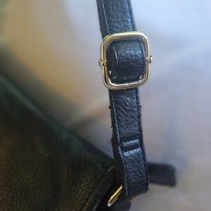 Black pebbled leather crossbody bag w adjustable strap, which can be converted to a shoulder bag.