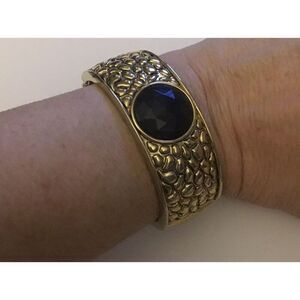 This is a pretty bangle bracelet that measures a full inch in width and has an open/close hinge closure. Done in an antique yellow gold plate finish and a pebble style texture, it features a round cut faceted black Swarovski Crystal stone that adds lots of sparkle!