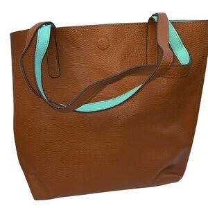 Pebbled Vegan Leather Brown and Turquoise Magnetic Closure Tote Bag