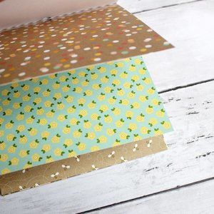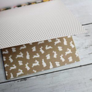 This cardstock paper pad includes bunnies, bees, strawberries, butterflies, floral, gingham plaid, kraft sheets, etc. The cardstock is thick and really nice quality. It is brand new.