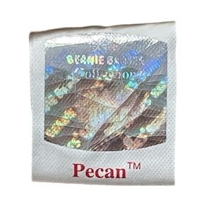 Ty Beanie Baby named Pecan the Bear. Pecan is a brown bear with black button eyes and a black nose. Her feet are a lighter shade of brown with black stitching for toes. The Beanie Baby has a Ty tag attached to its ear, indicating its authenticity and name. Pecan's date of birth is April 15, 1999, and the poem on the tag reads: "In late fall, as wind gusts blow, Pecan hibernates before winter snow, In early spring, sweet scent of a flower, Wakes her up to take a shower!". Pecan is part of the Ty Beanie Babies collection, which gained popularity in the 1990s. It is a collectible item, often sought after by enthusiasts.