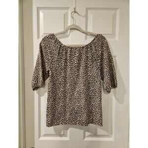 Short Sleeve 100% cashmere sweater top from Peck & Peck. No holes stains or other flaws. Great winter to spring transition piece- would be great under a blazer! A bit of a puff shoulder. Trendy animal print!