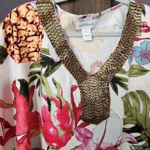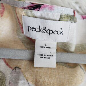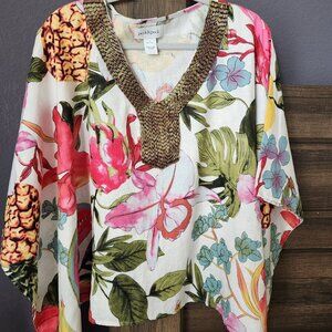 Peck & Peck 100% Linen Blouse L Floral Beaded Collar Poncho Oversize Boxy Kimono