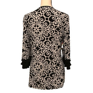 Black and white scroll design. The blouse closes in front with a hook and eye.